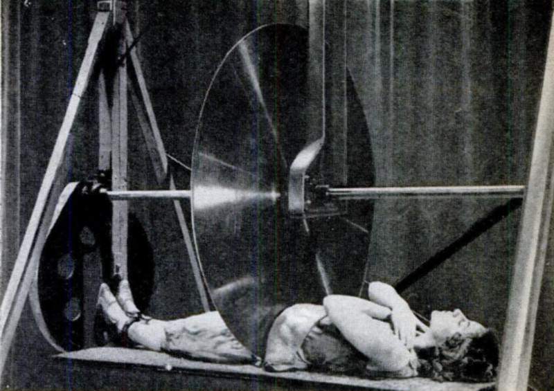 魔术师开始将躺在桌子上的人砍成两半,然后将身体的两半分开。身体被分开的助手依然很好,并且能够移动他们的头部和手臂,以及身体的另一半。。