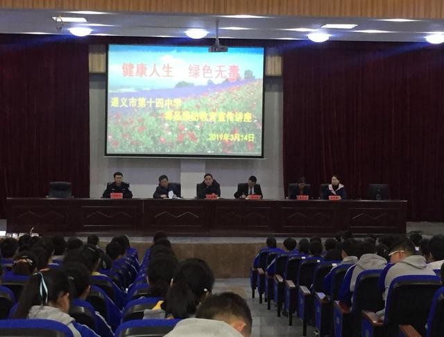 为了普及禁毒知识,遏制毒品蔓延,增强青少年学生的防毒、拒毒、禁毒意识,加强校园禁毒宣传力度,2019年3月14日由新舟镇禁毒办联合新舟镇司法所、派出所,一起走进了遵义市第十四中学开展了以“健康人生•绿色无毒”为主题的禁毒宣传教育活动。