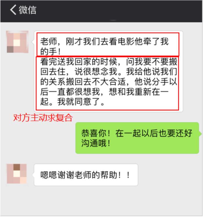 果然,男友按捺不住主动向若文发出一起看电影的请求,在看电影的过程中男友牵起若文的手,两个人非常有默契的又重新在一起了。