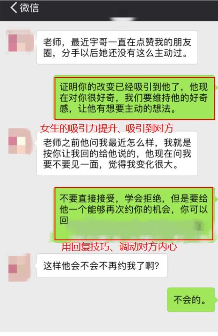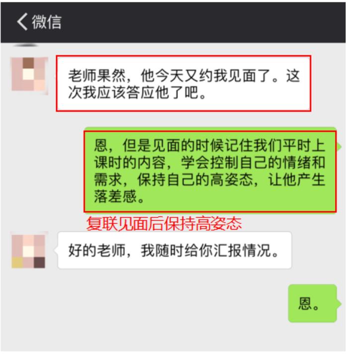 因为两个人分手,彼此都还保留着联系方式。所以导师让若文把自己的改变和状态通过朋友圈展示出来,以便男友可以看到。对于和男友的复联,导师建议若文要以一种高姿态的样子进行复联。