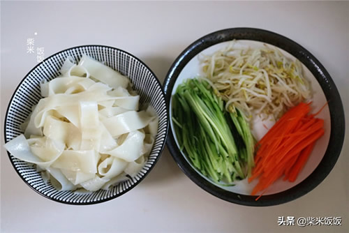 7,将凉皮切成宽条,再准备一些黄瓜丝、胡萝卜丝、烫熟的绿豆芽。