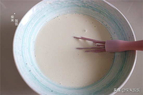 2,倒入约230毫升的凉水,充分搅拌均匀,得到细腻的可以流动的面糊,放置一边静置半个小时左右。这一步面糊的状态直接影响凉皮的口感,水的具体用量根据面粉的吸水性稍微调整,不要有太大的变化。