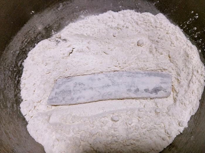 2、等时间到了,用筷子夹着带鱼段,先在面粉中滚一圈,全是裹满一层面粉,薄薄的一层就可以。