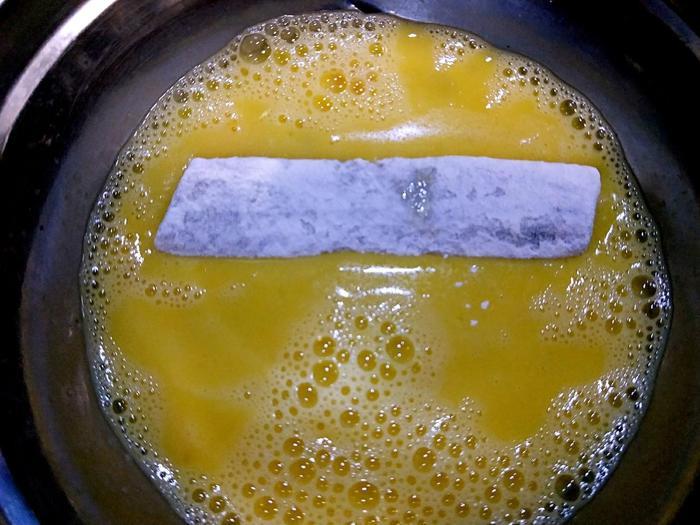 3、再放蛋液盆中,步骤一样,同样均匀地裹上一圈,让蛋液包裹住带鱼段。