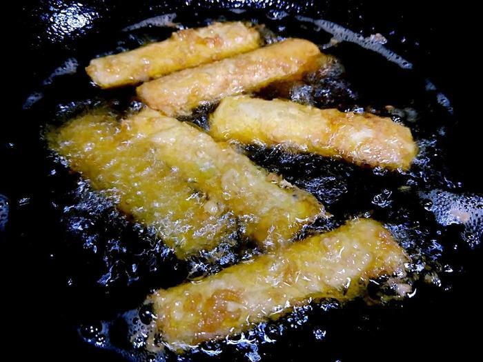 3、炸带鱼的时候,全程小火炸制,避免油溅射到身上。