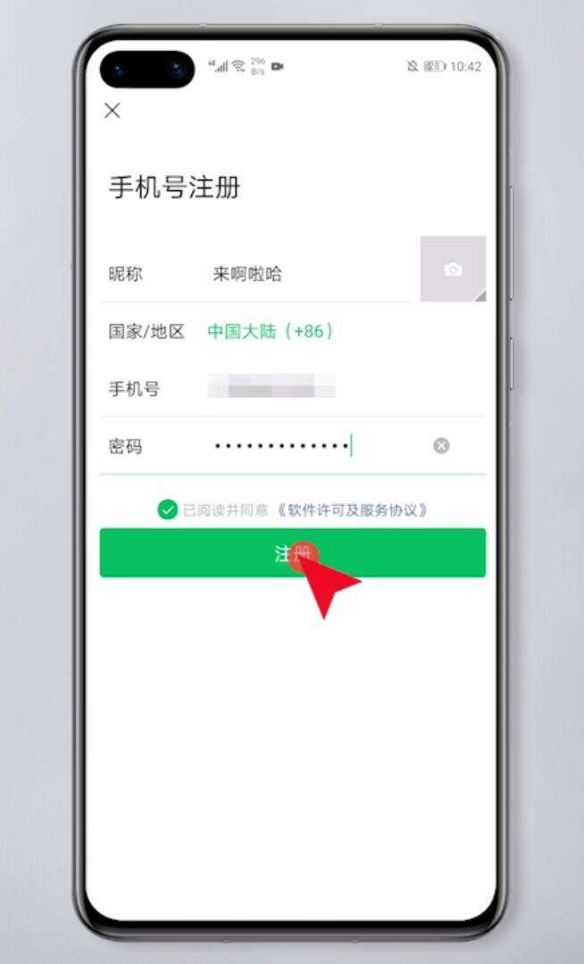 接下来就可以输入自己的手机号了,这个号码是要能接收短信验证码的哦,再设置一个自己的密码,都填好以后,点击下方的软件许可及服务协议,进入页面后认真阅读,阅读完毕之后,就可在前打勾了,最后点击注册,你的微信。