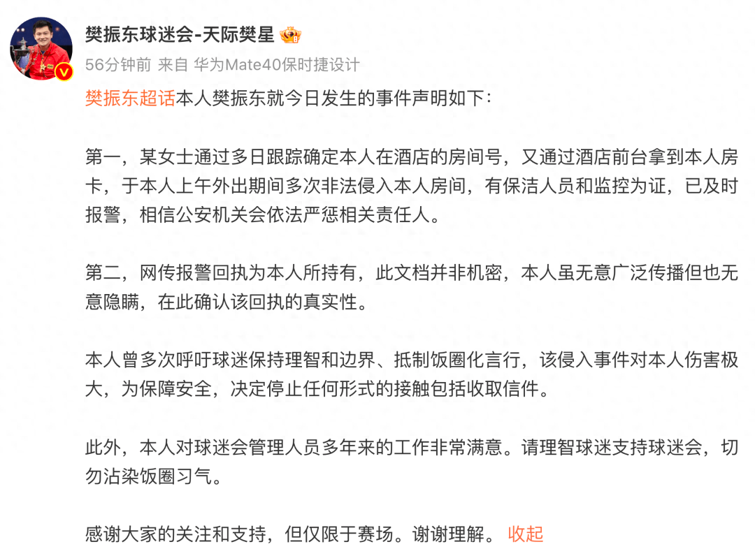今年四月份,传出樊振东的房间被私自闯入,并报了警。