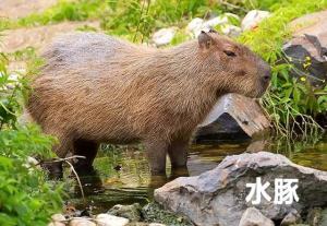 水豚:啮齿目水豚科动物,分布于美洲巴拿马运河以南地区。躯体巨大,体长1~1.3米,肩高0.5米左右,体重27~50千克,世界上最大的啮齿动物。