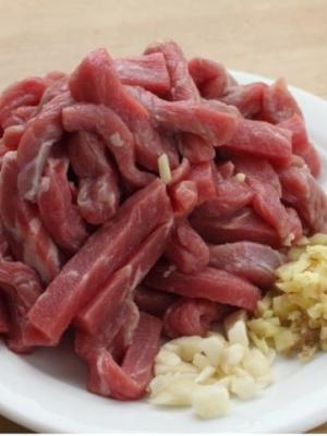 1、姜洗净去皮,剁成末;洋葱肉撕去外皮,切成宽2厘米、长5厘米的片状。辣椒切片,香芹切段做,牛肉剔净筋络,用利刀切成细条肉。