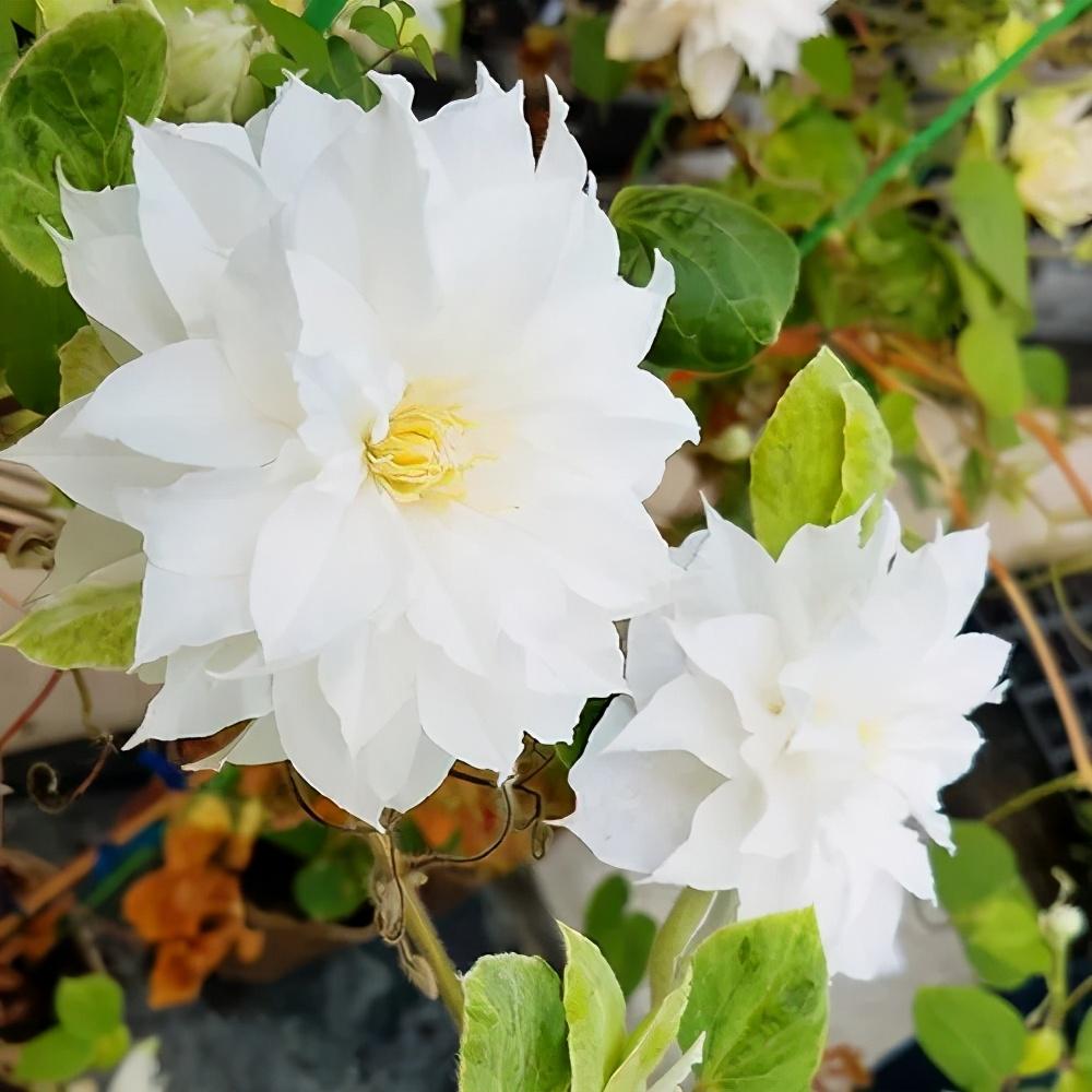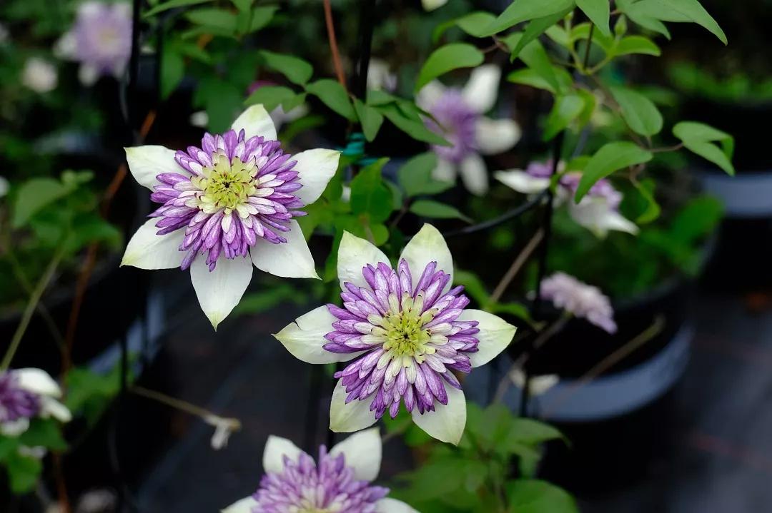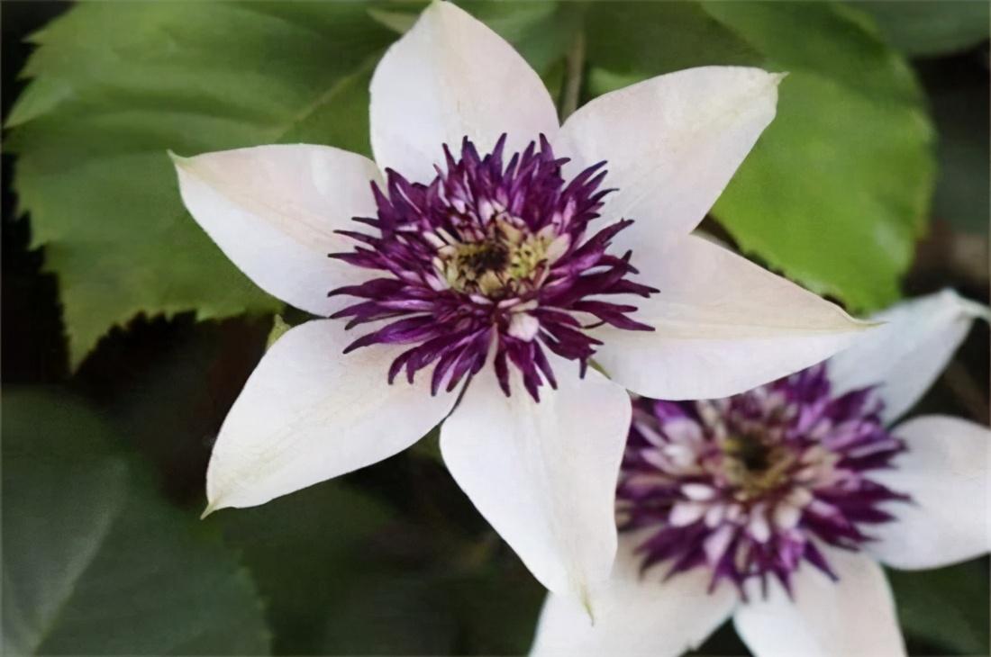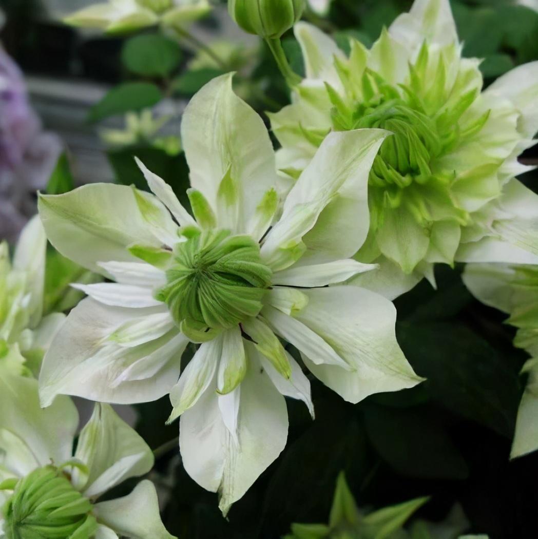 它是很多铁迷最喜爱的品种,白色的瓣化花萼簇拥了紫色的瓣化花蕊,丝丝入扣,像紫色王冠落玉盘一样精致。新幻紫花色清新别致,花瓣乳白色偶有浅绿色,花朵中央的大团暗紫色花蕊较幻紫更宽大颜色更浅一些。虽易得枯萎病,发现后马上修剪却也很容易重新发芽,新手慎买哦!