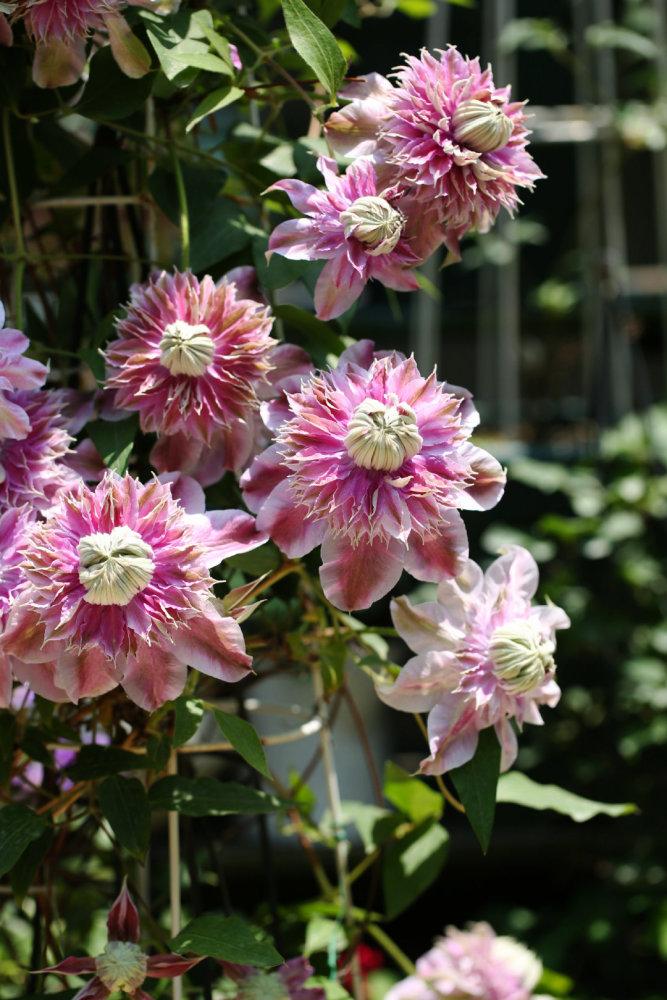 花朵呈现粉红色,是铁线莲中的重瓣品种,天冷的时候,花瓣还会微微变绿,超级适合盆栽种植。