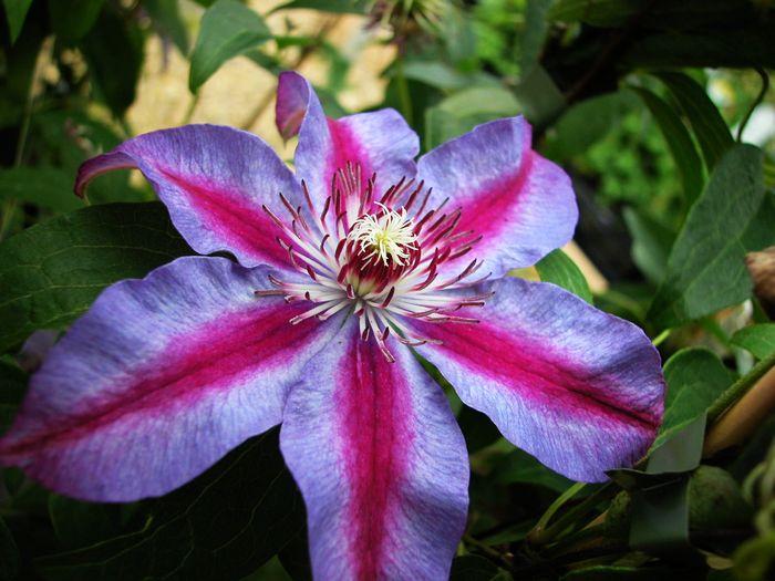 紫光也属于早花大花型铁线莲。紫色的花瓣中间有白色的线条,好像一道光,所以被命名为紫光,非常容易分辨。重瓣的花型颜色为深蓝紫,开花比较多变,是由总统演变而来的品种,有的时候会开花不太标准。
