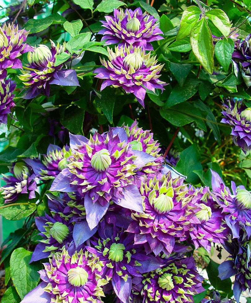 多蓝铁线莲花如其名,它的颜色较深,也是属于大花早花型铁线莲。这个品种的铁线莲,它的花蕊非常特殊,花蕊密集呈须状,花瓣呈莲花形。无论是花型还是颜色都非常好看。这个品种生长旺盛,攀爬性很强。是非常值得收纳的品种。