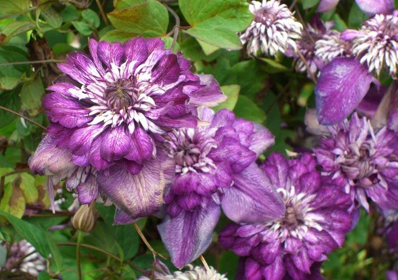 伍斯特美女也是一个早花大花型的重瓣品种,它的花瓣层层叠叠,非常美丽,颜色呈紫蓝色,是我最喜欢的铁线莲品种之一。它的花非常特殊,老枝开重瓣,新枝开单瓣,所以一种花可以欣赏两种花型。