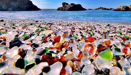 玻璃海滩位于美国加州布拉格堡。看到今天的玻璃海滩,很难相信这个如此美丽的地方居然在当地充当了近20年的垃圾场,后来绝大多数较重的垃圾被运出沙滩,剩下的数吨碎玻璃逐渐被海浪冲刷成五彩斑斓的小圆石,太平洋代替人类完成了最终的清理工作。