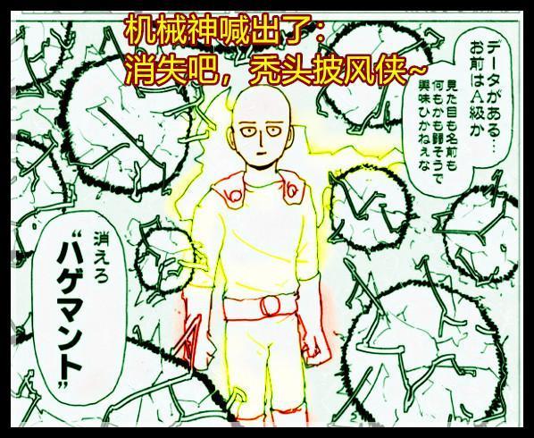 但是人群中,只有琦玉老师一动也不动,机神调查眼前的埼玉老师数据原来是A级,但却直截了当的吐槽埼玉老师,不管是外表,还是名字,全都感觉好 弱,完全没兴趣啊。最后还说出了【消失吧,秃头披风侠】的话语。