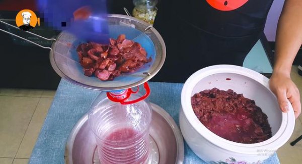 7、时间到时拆去保鲜膜,用滤网过滤去葡萄皮和葡萄籽就可以饮用了,放入冰箱冷餐口感更佳。这样一瓶口感极佳的葡萄酒酒做好了