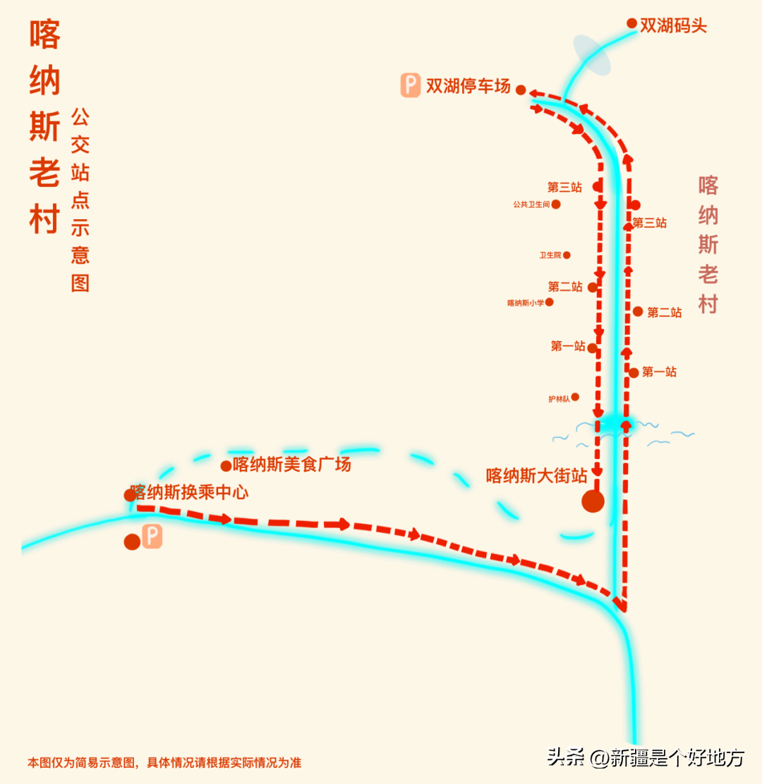 发车点为喀纳斯换乘中心,途径三站,抵达双湖停车场,返程途径三站,抵达终点站——喀纳斯大街站下车。