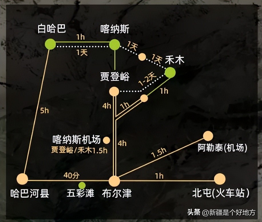 乌鲁木齐——(经216国道)——布尔津——省道S232线——喀纳斯景区