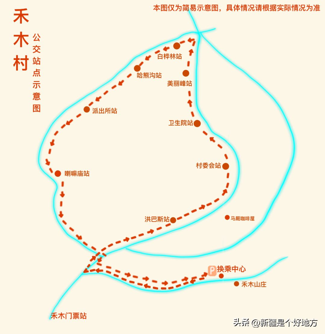 发车点为禾木换乘中心(禾木山庄旁),公交车在禾木村内行驶一周,最后返回至禾木换乘中心。