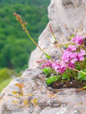 岩石上生长的花对树木的特写,Close-up Of Flower Growing On Rock