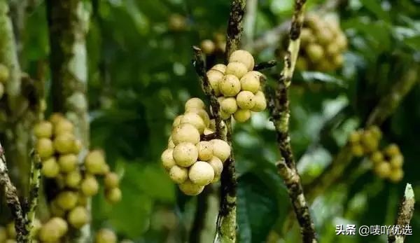 这个就是龙宫果(中文学名:龙功果),它的果子是贴着树干生长的,所以表皮会有黑点,外观不是很漂亮,而且它里面的果肉和大蒜也很相似,一瓣一瓣的和山竹的果肉也很像。