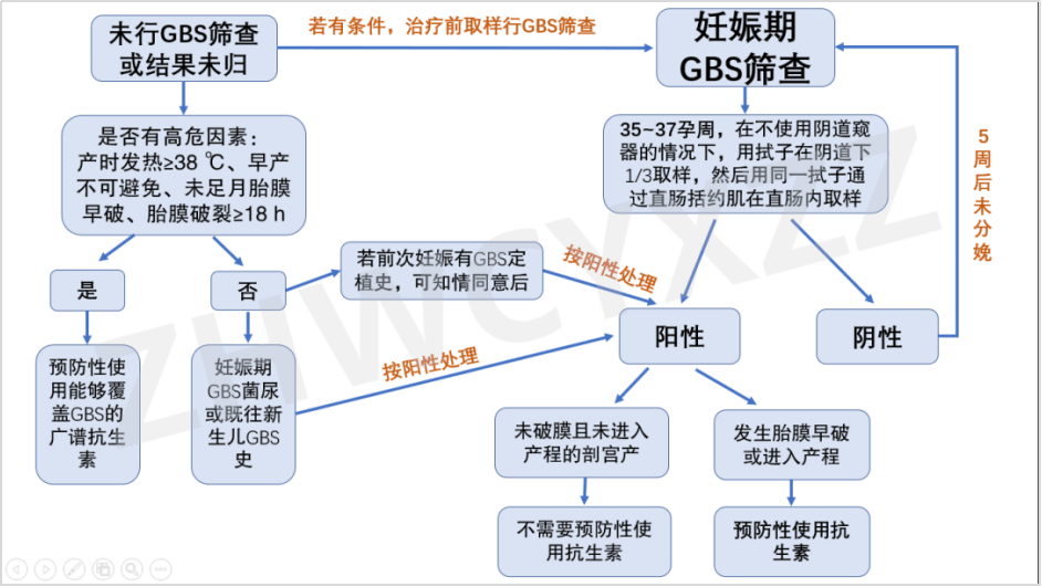 ➱B族链球菌筛查有效期为5周,尤其筛查结果为阴性的孕晚期孕妇,
