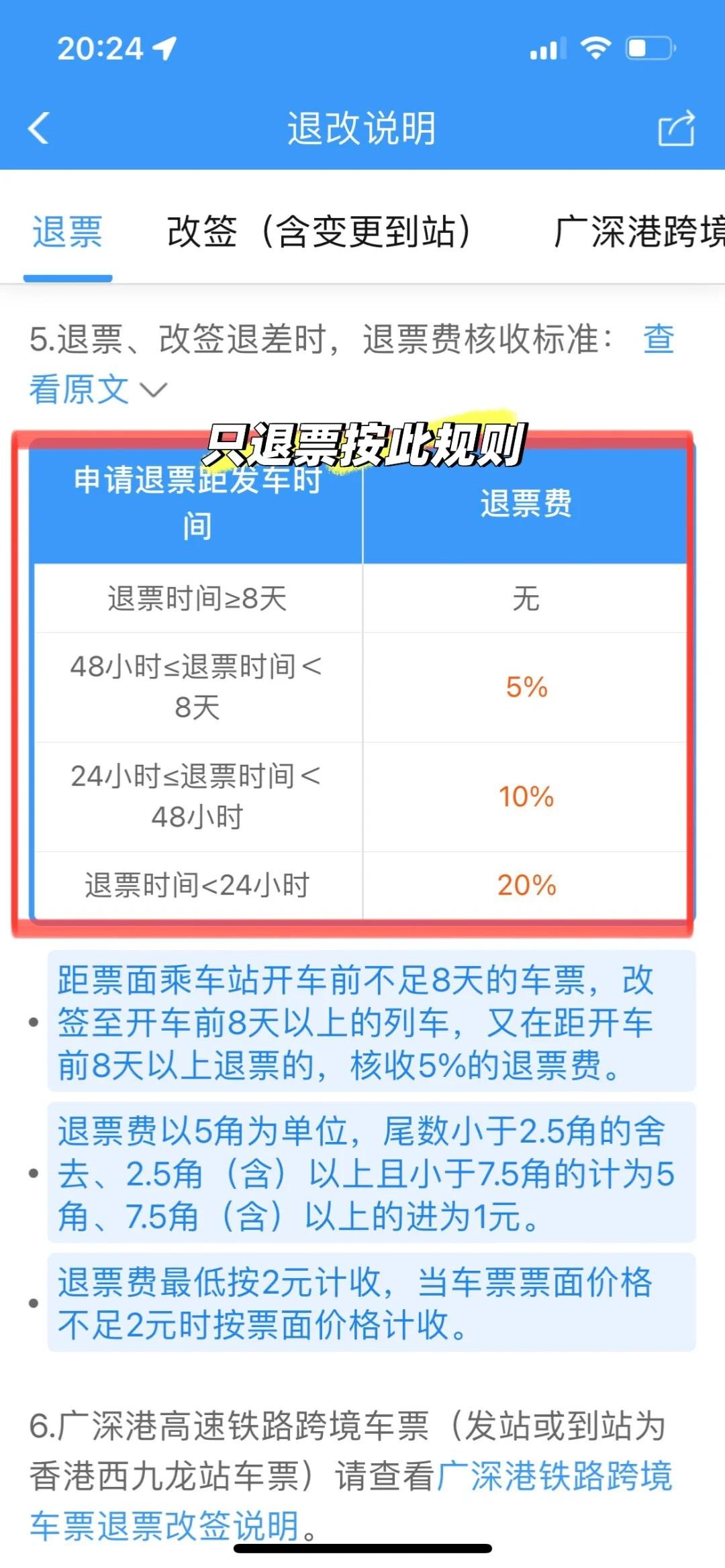 而在上述期间未改签只退票的话和平日一样,按照0至20%阶梯收费,详见下图。