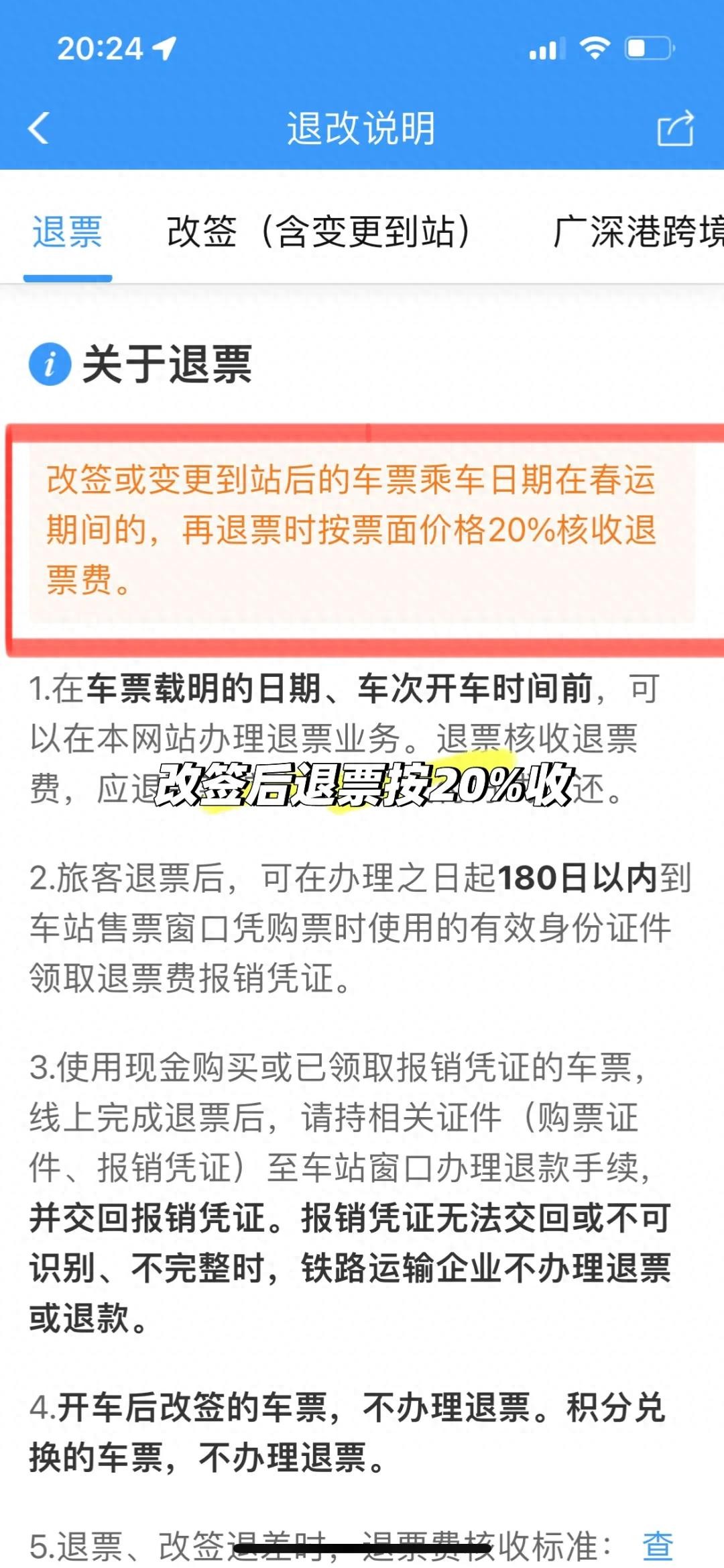 而在春运期间改签后再退票的,一律按20%收费,具体详见下图。