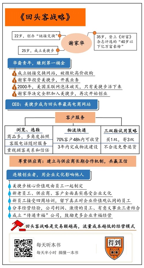 其次,谢家华作为美捷步的 CEO,凭借“回头客战略”,完成了销售额从0到十亿美元的飞跃,也把美捷步打造成了顾客回头率最高的电商网站。