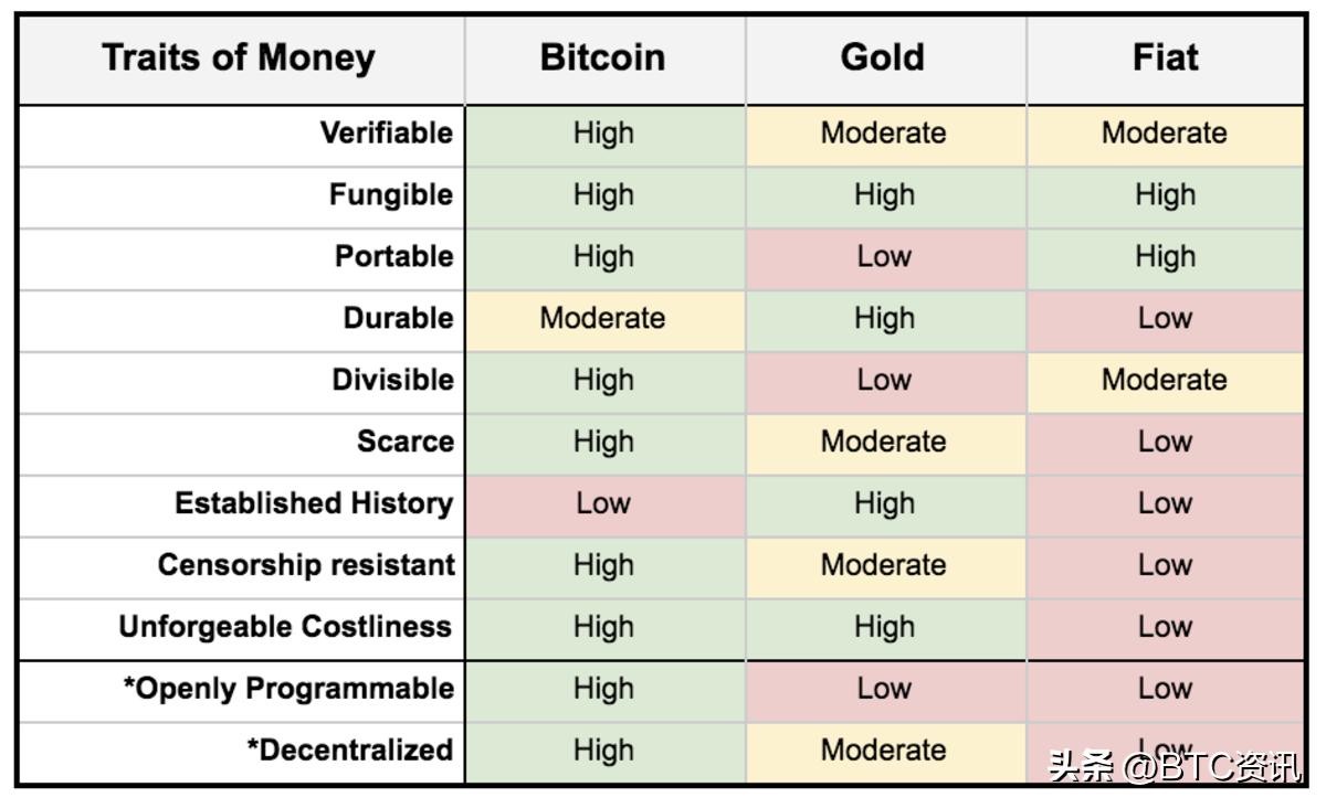 如果我们加上稀缺性和抗审查性、可编程性和去中心化等其他特性,比特币接近于有史以来最完美的货币类型,如下所示。