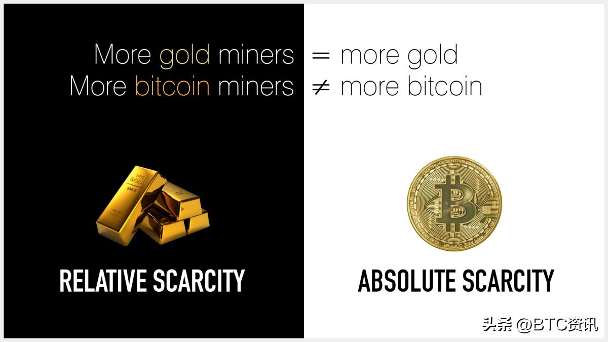 这两种商品都很稀缺,但没有人知道黄金的整体供应量,而我们知道只有大约 2100 万个比特币在流通。黄金具有相对稀缺性,这意味着相对于开采它所消耗的能量而言,它是稀缺的。比特币是绝对稀缺的,这意味着它是有限的。无论通过挖矿消耗了多少能量,网络都将继续以相同的速度和硬上限发行新区块。
