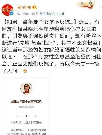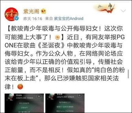 当李小璐和PGone“夜宿门”闹的满城风雨的时候,PG one的歌曲《圣诞夜》被网友举报,并被紫光阁连发三条微博点名批评。