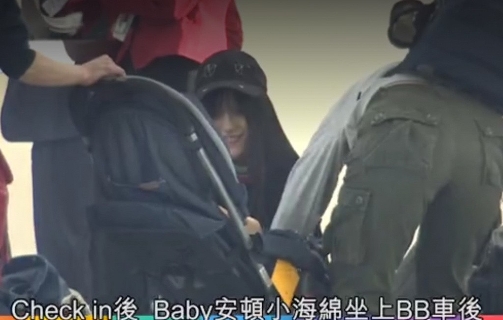 在候机的短短时间里,baby 一边先把小海绵安顿在婴儿车里,一边又半蹲着跟小海绵互动嬉笑,满脸都是藏不住的甜笑容。