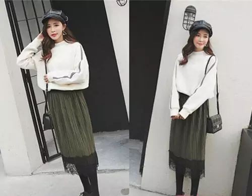 白色的毛衣简洁百搭,简约的半高领设计保暖又显气质,衣袖的撞色条纹设计更是时尚感倍增,下身搭配的军绿色半身裙,百褶的元素拼接着蕾丝的裙摆又多几分女人味。