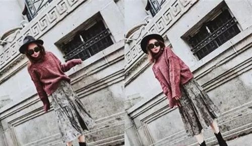 暗红色的毛衣低调又好看,简洁的款式怎样搭配都好看,加上军绿色半身裙,半身裙百褶的设计结合碎花的印花设计,时尚又甜美。