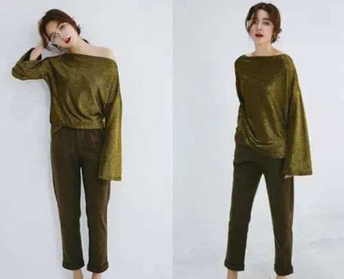 整套军绿色的服装搭配最是简单百搭,深浅色的颜色不显单调,而军绿色的上衣加上金丝线的设计十分吸睛,加上军绿色的九分裤搭配,休闲又潮流。