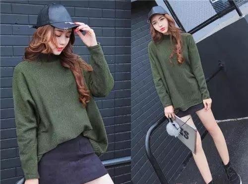 军绿色的毛衣采用宽松的版型设计遮肉又显瘦,螺纹的衣领设计穿着舒适又大方,下身再搭配一款深蓝色的半身裙,让女生看起来休闲又不失时尚感。
