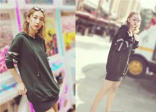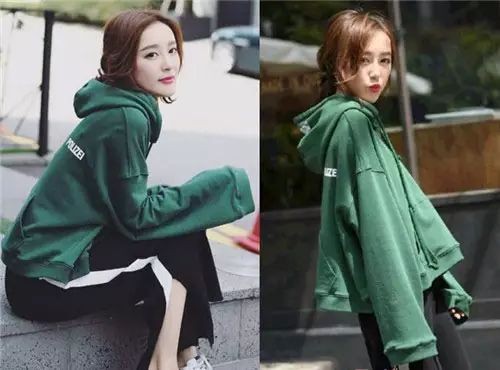 这款军绿色的卫衣设计非常特别,活动的帽子让你可以前后两穿,一件顶两件,下身搭配一款黑白色撞色的条纹阔腿裤,让女生看起来时尚又不失休闲感。