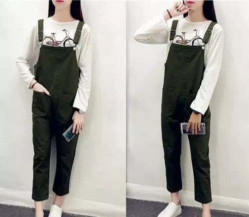 简约百搭的白色T恤,加上自行车的印花设计更是时尚又个性,军绿色的背带裤,非常好搭配,肤白的妹子更是轻松hold住,整体的搭配休闲又好看。