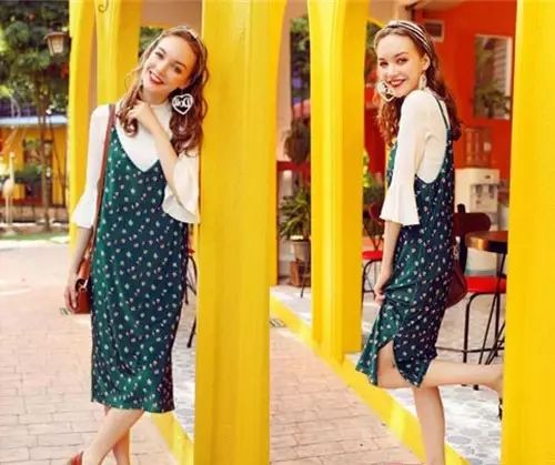 军绿色的连衣裙,V领吊带的设计性感又好看,加上碎花的设计甜美又时尚,内里搭配的白色针织衫,喇叭袖的设计十分时髦,棕色的鞋包更为造型加分。