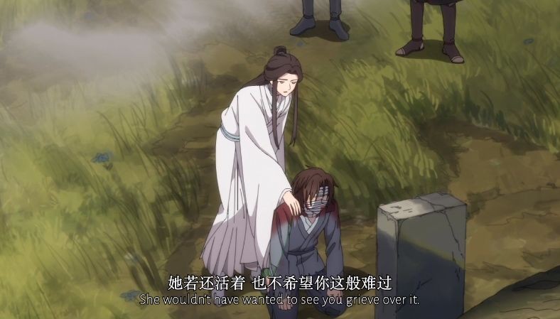 小萤姑娘因为从怜怜画出的保护圈中跑了出来吸引宣姬的注意,这才让谢怜找到机会把宣姬暂时捆了起来,小萤姑娘也是因此被宣姬摔在地上致死!这样一个善良的姑娘便没了,也是十分的可惜!而谢怜和南风扶摇在安葬了小萤姑娘之后,他们也是商量着如何安置绷带少年的去处,但是谢怜也是说道没办法带绷带少年回天上。