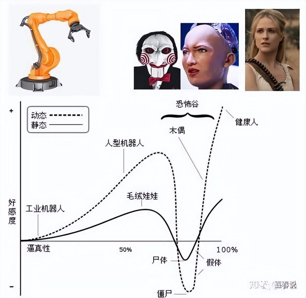 比如一个玩偶,如果某些地方特别像人,但有的地方却十分不像人,这种矛盾,会使人们对其的好感度跌落谷底,这个谷底就是“恐怖谷”。