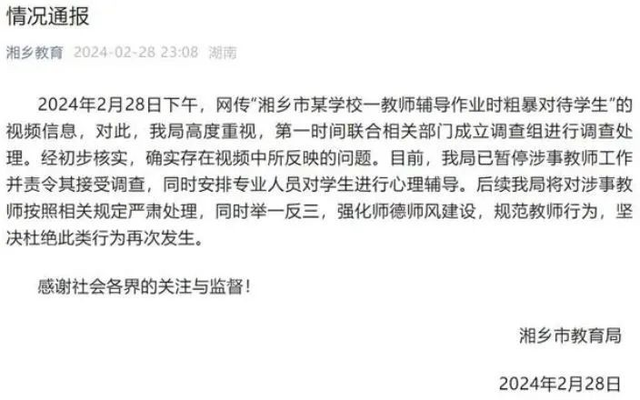 事情曝光后,当地教育部门暂停涉事教师的工作并责令其接受调查,同时安排专业人员对学生进行心理辅导。