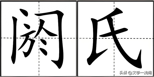 先说“阏”字,小篆字体中,依旧是半包围结构,外面为“門”字,里面为“於”字。“於”字金文字形类似一只展翅飞翔的乌鸦,后来上喙处逐步演变为“人”形,下部多出了两笔装饰性画,小篆整个字形变得臃肿庞大。“”。“於被包裹在门内”,形体像一团淤泥堵塞了門,或者说“於被关在闸门内了”,造成了“堵塞、阻塞”,因此“阏”的本义为“闸门”、“堵塞”。然后再次演变简化,最终成了楷体的“阏”字了。“氏”字最初字形类似一个面部朝右侧立 且手拿陶器的一个‘人’形,后来陶器物品到了手臂中间,又演变成一“横”,最后演化、简化成楷体字的“氏”了。