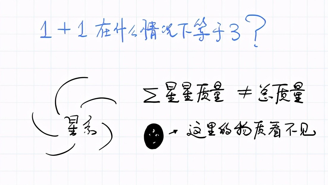 在这种情况下,我们想象这个星系当中可能有看不见的幕后黑手。这让我想起一道脑筋急转弯,叫做“1+1在什么情况下等于3?” 你们可能都知道,在算错了的情况下等于3,但是科研工作者并不喜欢这个答案,我们可以给大家另一个答案:1+1,再加上一个看不见的“暗”数字1,那么也可以等于3。什么意思呢?就是说,我们星系当中所有的可见物质加到一起,不能提供足够的引力去维持速度几乎不变的旋转曲线。怎么办?我们就再加一些看不见的物质,这种看不见的物质我们叫作“暗物质”。