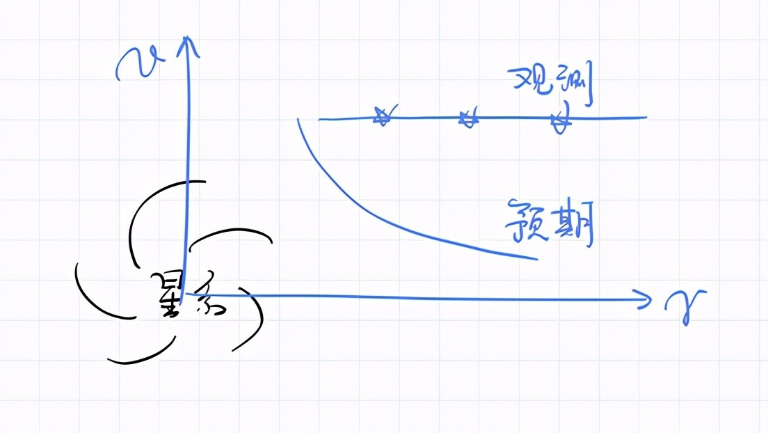 当然了,我们的太阳系当中并没有发现这样的幕后黑手,但是在我们的银河系以及几乎所有其他星系当中,我们都发现了这种幕后黑手。我们观察一个星系,会发现在离星系中心很近的地方有非常非常多的恒星,离星系中心远的地方恒星就越来越少。考虑离星系中心足够远的地方,是不是它们的运动速度应该越来越小,但是我们的观测表明,运动速度不一定是越来越小的,也可以几乎不变,甚至有的星系中,会稍稍上升一点,即使稍稍下降一点,下降速度也达不到我们的预期。