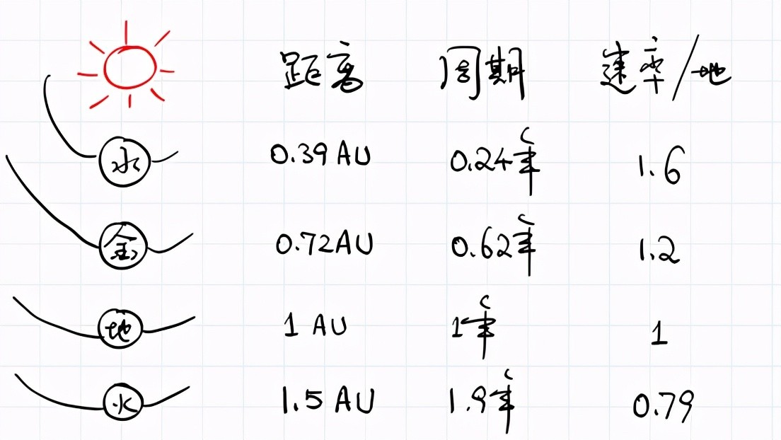 我们的太阳系由太阳以及围绕其转动的水星、金星、地球、火星等星体构成。水星、金星、地球、火星,我们很容易查到它们离太阳的距离以及它们运行的周期,这样就可以去计算它们运行的速率。可以看到,随着距离太阳越远,速度越来越小,这告诉我们离太阳越远的物体受到的太阳吸引力就越弱,所以它就不用跑那么快得去做圆周运动了。
