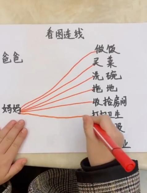 前段时间一位妈妈把自家女儿做“连一连”这个题目的照片放到了网上,图片上的题目是左边分别写着爸爸和妈妈两个主题,而右边则是列举了许多家庭日常家务活,比如说:扫地,拖地,洗衣,做饭,打扫卫生等等,而题目就是让女儿把左边和右边连接起来。