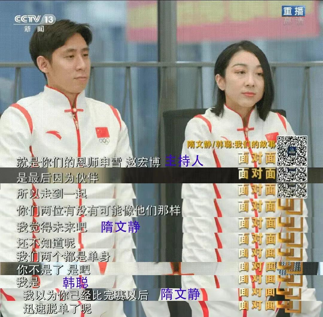 隋文静紧接着解释为什么会反问韩聪个人感情的事:不是,那我也不知道,我以为你比完赛以后,迅速脱单了呢!